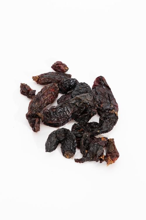 Chile seco de color cafe rojizo, tiene forma triangular, su piel es de textura rugosa y brillante, debe ser flexible al tacto y nunca tieso.